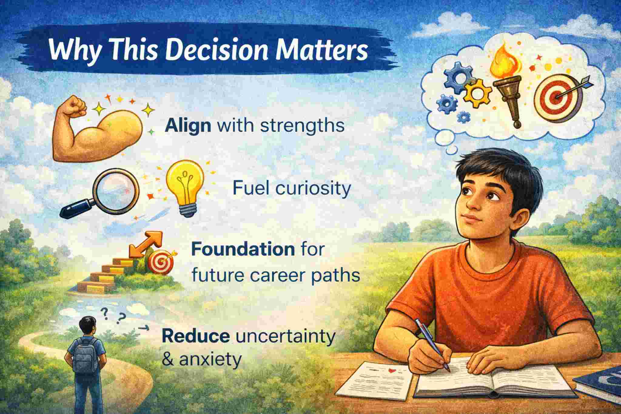 A structured approach to selecting Science, Commerce, or Arts based on aptitude, interest, and long-term direction – not peer pressure.